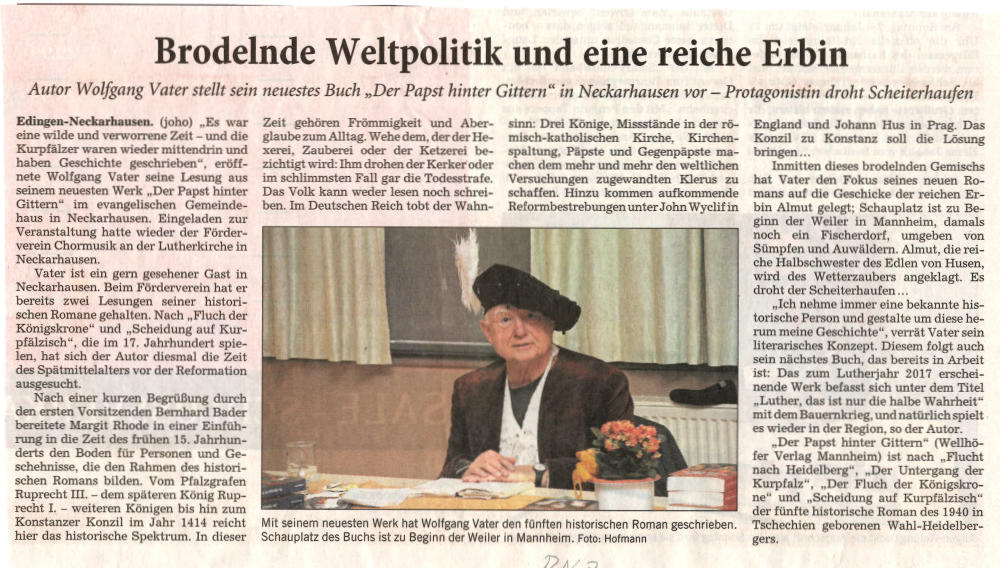 ein. Er stellt seinen in diesem Jahr erschienenen historischen Roman „Der Papst hinter Gittern“ vor.