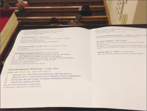 von Heinrich Schütz mit dem Bläserensemble; die Musik schwebte echomäßig aus drei Richtungen durch die Kirche. Unter