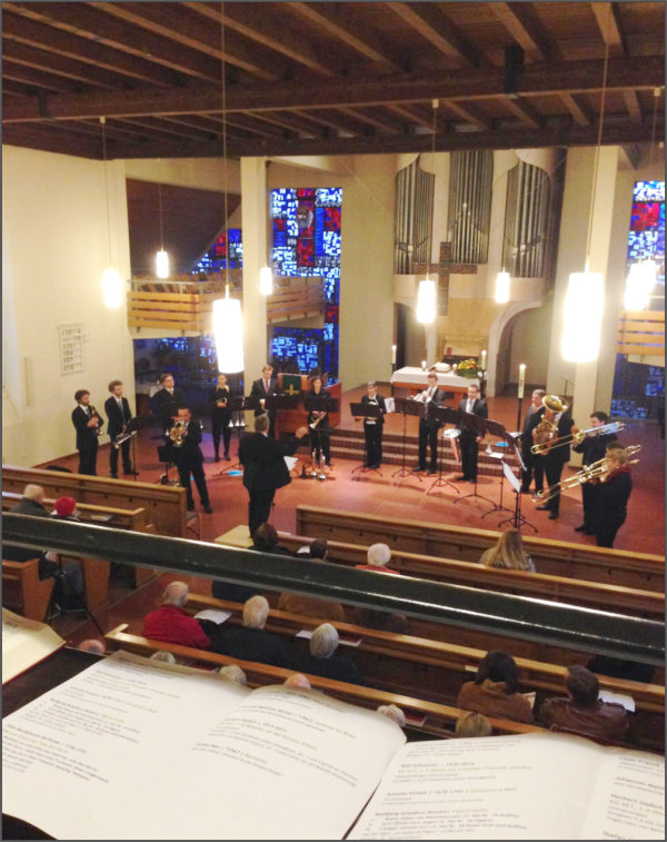 von Heinrich Schütz mit dem Bläserensemble; die Musik schwebte echomäßig aus drei Richtungen durch die Kirche. Unter